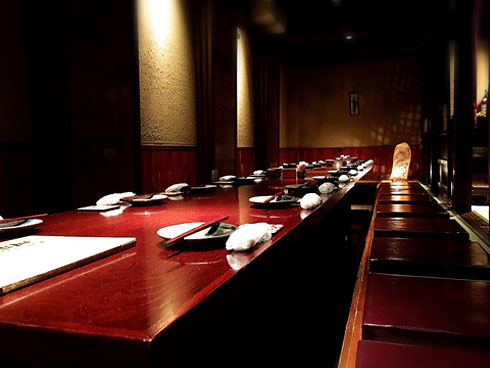 奥行きのある贅沢な雰囲気のカウンター。えびすの職人技をご観覧いただけます。